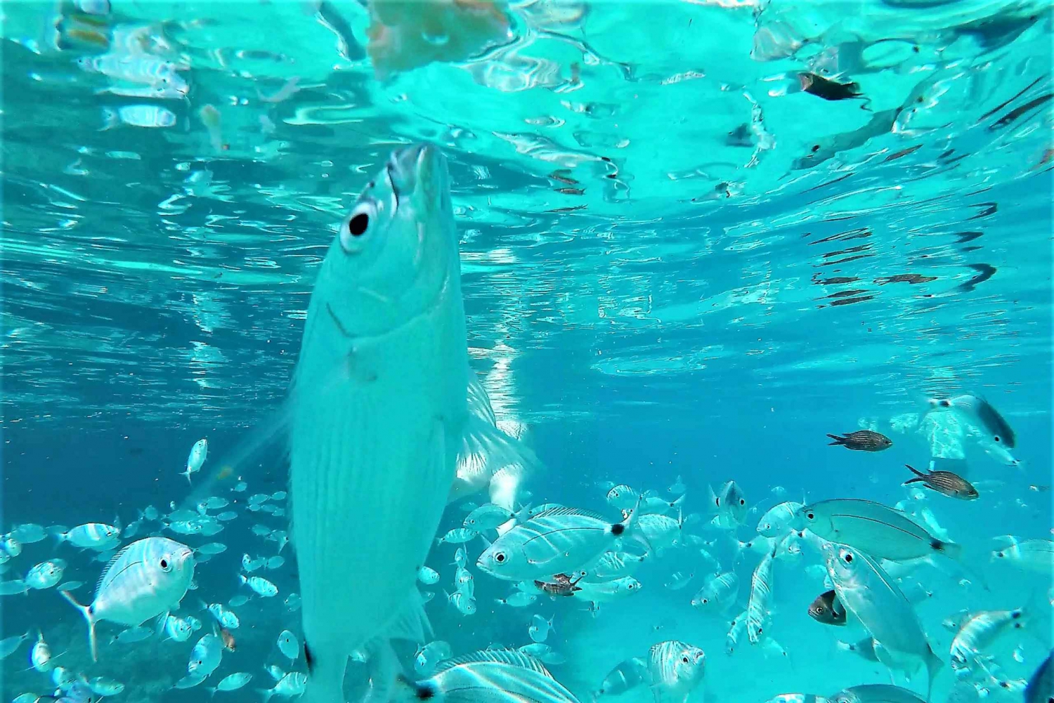 Blæksprutter i de små huler i klipperne, stenfisk, de fantastiske Posidonia-havengræs og smukke fisk med en sort plet, der vil omringe dig uden at røre dig.