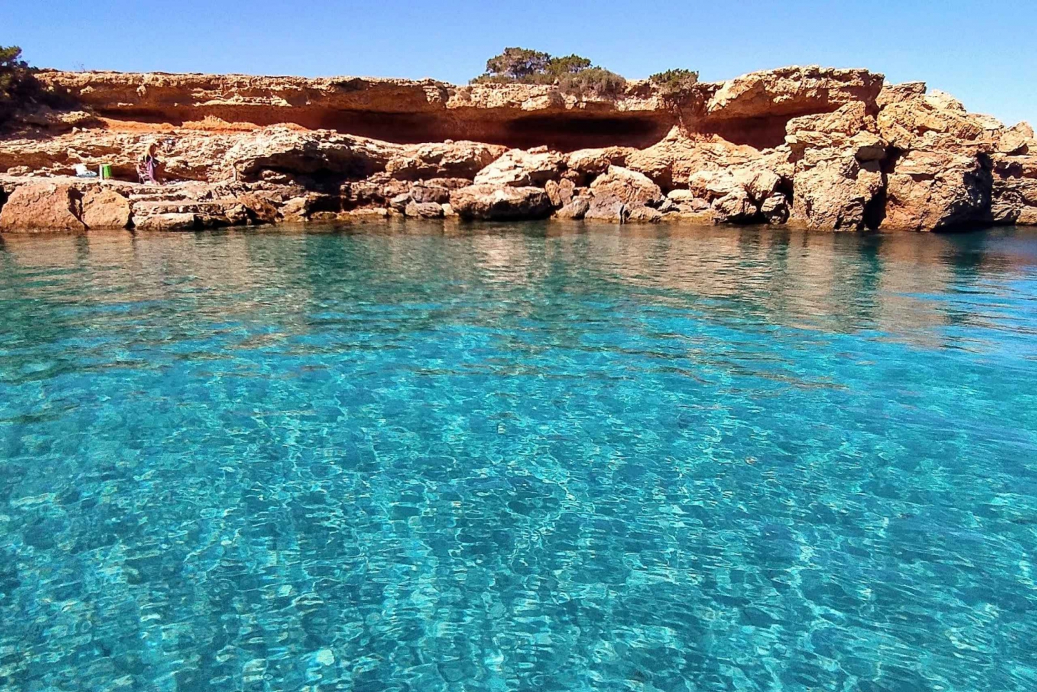 Cala Conta er kendt for sit krystalklare blå vand og sandstrande. Når båden har ankret op ud for kysten, adskilt fra kystlinjen, kan du hoppe i vandet for at snorkle, paddleboarde eller bare svømme.