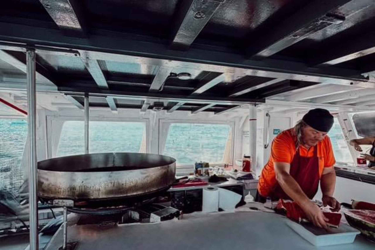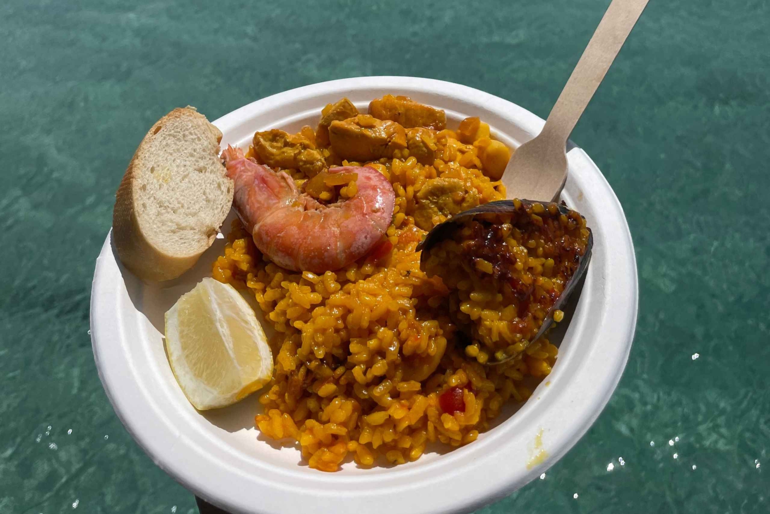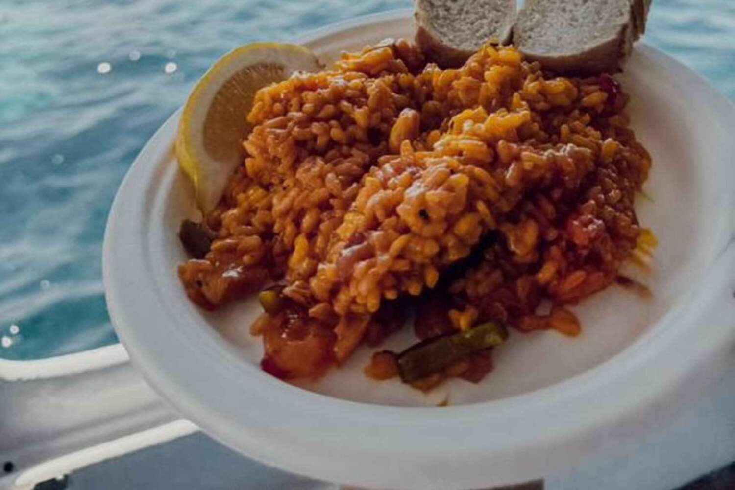 Vi sejler kl. 10.00 fra San Antonio, hvor vores venlige besætning byder dig velkommen om bord med en frisk morgenmad, så du kan starte dit eventyr med stil. Mens vi sejler langs Ibizas smukke vestkyst, kan du nyde den betagende udsigt over Cala Comte og Cala Tarida – og hvis vi er heldige, kan vi måske se legesyge delfiner undervejs. Vores første stop er den legendariske Es Vedrà, den mystiske ø omgivet af myter og skønhed. Den rejser sig dramatisk fra havet og er et af Ibizas mest ikoniske vartegn. Her vil vores besætning dele de fascinerende historier og legender, der omgiver denne gådefulde klippe, mens du tager uforglemmelige fotos af dens magiske silhuet. Derefter lægger vi til ved den idylliske ø Espalmador, et paradis med krystalklart vand. Hop i vandet for en forfriskende svømmetur, prøv snorkling eller paddleboarding, eller slap bare af og flyd under Middelhavssolen. Tilbage om bord kan du genoplade med en lækker paella-frokost, ledsaget af ubegrænset øl, sangria og sodavand. Om eftermiddagen sejler vi til Formentera, hvor du får 4-5 timers fritid til at udforske øen i dit eget tempo. Gå en tur på de uberørte hvide sandstrande, opdag charmerende lokale steder, eller lej en cykel, scooter eller bil med vores eksklusive rabatter for at opleve øens naturlige skønhed og afslappede atmosfære. Når dagen langsomt går på hæld, begynder vi vores hjemrejse mod Ibiza, hvor vi endnu en gang passerer det magiske Es Vedrà. Så kommer dagens højdepunkt: samlet på dækket løfter vi et glas cava og skåler, mens solen smelter sammen med horisonten – en magisk fejring af en perfekt dag på havet. Der serveres en let middag om bord, mens de sidste solstråler maler Middelhavets himmel. Vi ankommer tilbage til San Antonio omkring kl. 21.00 med uforglemmelige minder om havet, solen og den ægte magi på Ibiza. ⚓ Inkluderet: Morgenmad om bord Paella til frokost Let middag Ubegrænset drikkevarer (øl, sangria, sodavand) Cava-skål ved solnedgang Snorkel- og paddle-surfudstyrIncludes
