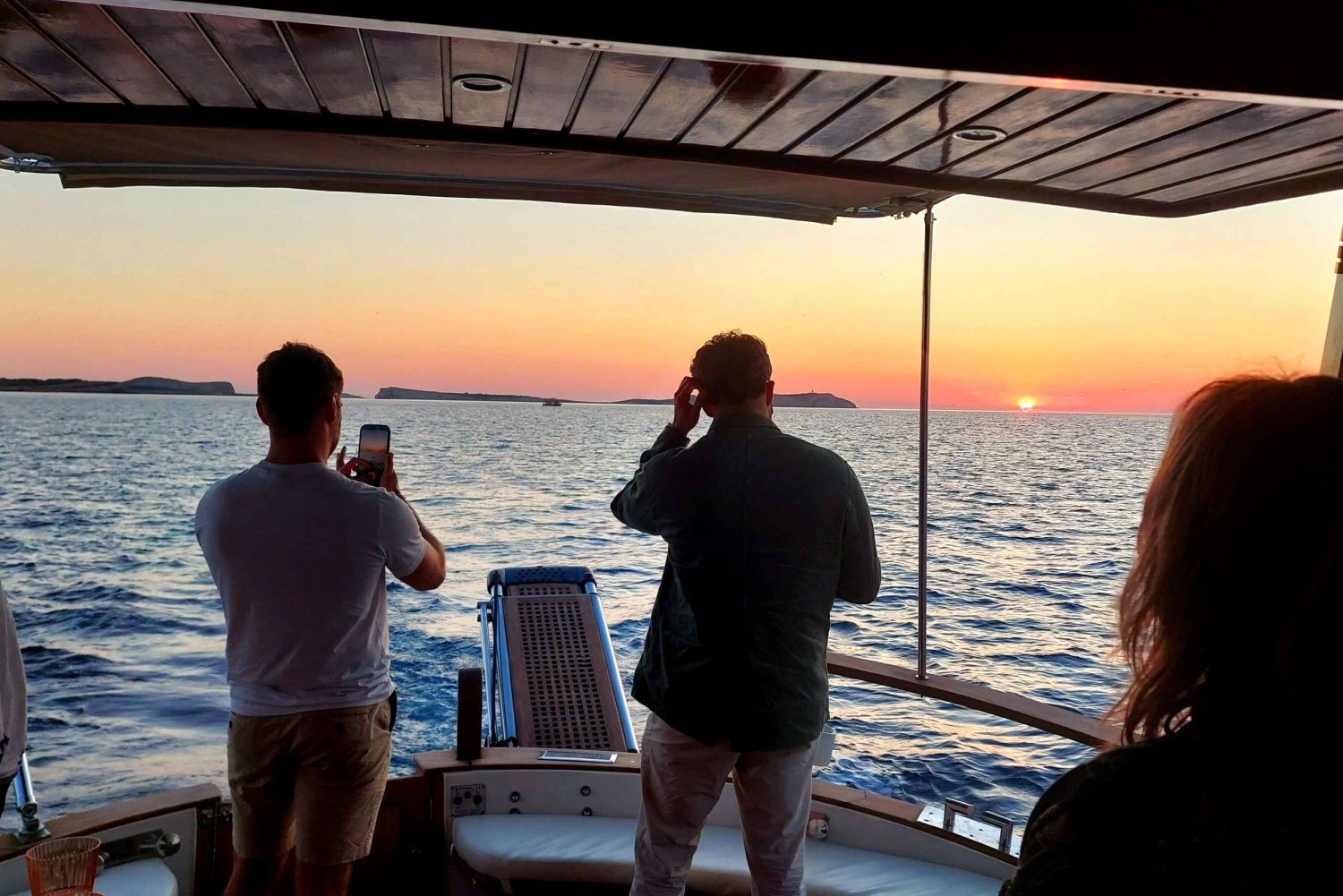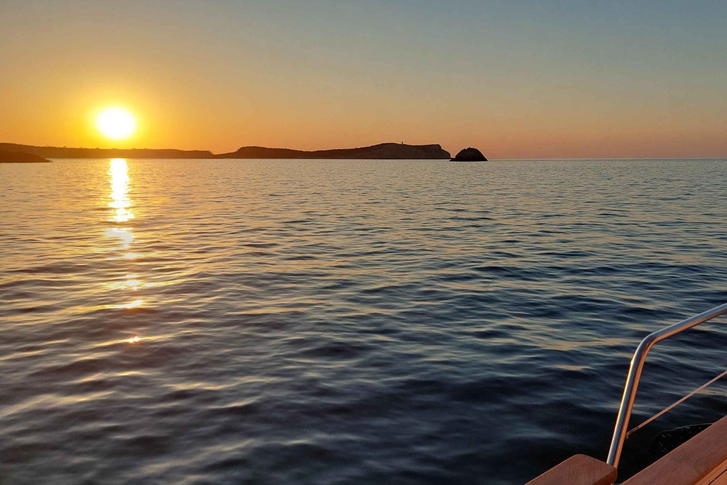 Step aboard Aruna, a beautifully restored traditional Balearic llaüt, and embark on an unforgettable sunset cruise along the coast of Ibiza. This charming vessel combines authenticity, elegance, and comfort, offering an intimate way to discover the island’s natural beauty. As the sun begins to dip below the horizon, sail past iconic spots like Ses Margalides, Cala Conta, Cala Bassa, Café del Mar, and Café del Mambo—each offering a different view of the breathtaking Ibizan sunset. Whether you choose to relax on deck with a drink in hand, take a refreshing swim in the crystal-clear waters, or simply float peacefully as the colors of the sky change, this experience promises tranquility, wonder, and a true connection to the Mediterranean spirit. A perfect escape for couples, friends, or anyone who wants to see Ibiza from a new perspective.Includes