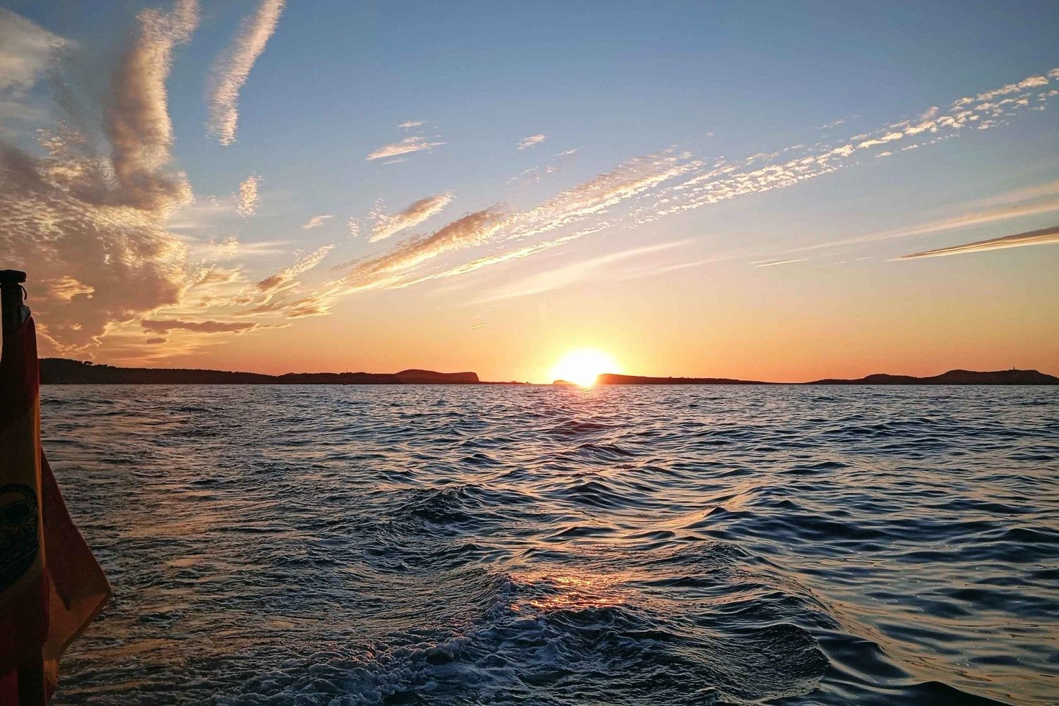 Cette incroyable expérience de plongée avec tuba au coucher du soleil en bateau autour de la côte ouest d'Ibiza est le moyen idéal pour découvrir la vie marine en toute sécurité et allier plaisir et détente. Cette expérience vous permettra de vous essayer à la plongée avec tuba ou à la natation dans deux criques magnifiques. Pendant la sortie en bateau, vous verrez de petites îles, des grottes, des récifs et des réserves naturelles le long du littoral pittoresque d'Ibiza. Alors que le bateau glisse sur les eaux cristallines, vous pourrez admirer des vues imprenables sur la côte accidentée et ses plages immaculées.